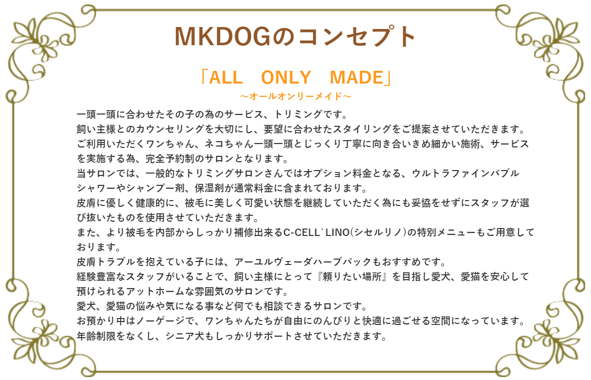 当サロンでは、お客様の大切な家族であるワンちゃん、ネコちゃんの心と体の健康をサポートする“ALL ONLY MADE”をご提供いたします。